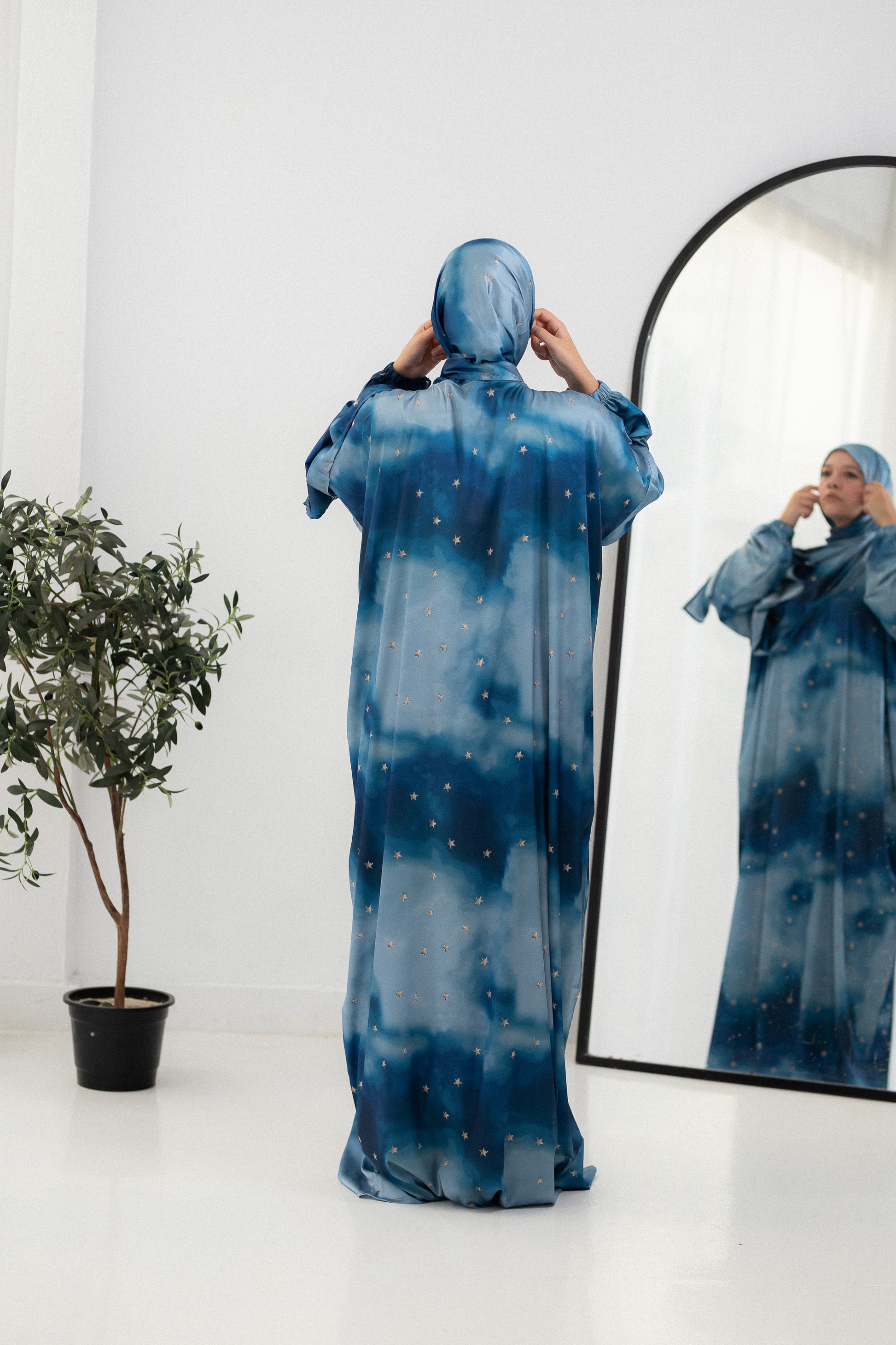 Midnight sky Prayer Dress features premium satin construction that delivers exceptional softness and comfort throughout your prayer practice. This elegantly designed garment combines understated sophistication with practical functionality, creating an ideal foundation for meaningful spiritual moments.
